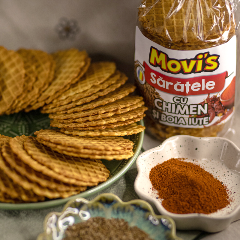 Sărățelele cu chimen și boia iute Movi's. Gustul clasic poate fi și iute! Aroma fină a chimenului copt complementată de gustul ușor picant de boia, iute cât să te facă să le stingi cu ceva rece.